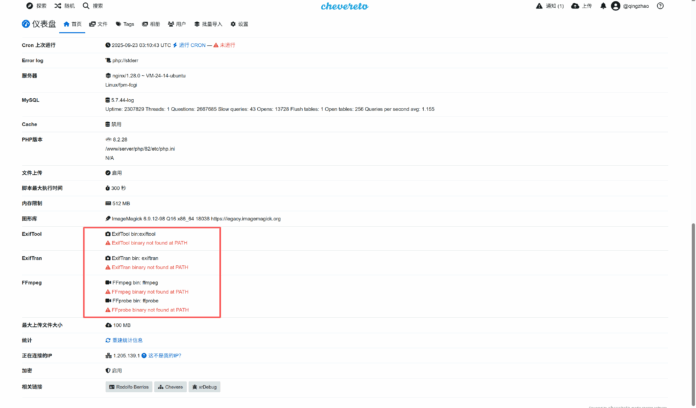 Chevereto V4版本新增了视频存储,需要转码,因此程序依赖了FFMPEG和FFPROBE转码服务,所以需要你的服务器安装好FFMPEG。